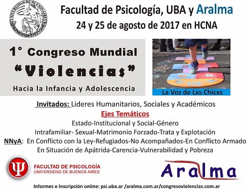 El próximo 24 y 25 de agosto se realizará el 1° Congreso Mundial “Violencias” hacia la Infancia y Adolescencia organizado por la Universidad de Buenos Aires, Facultad de Psicología y el Centro de Asistencia, Investigación y Formación en Psicoanálisis con Perspectiva en DDHH (Aralma).