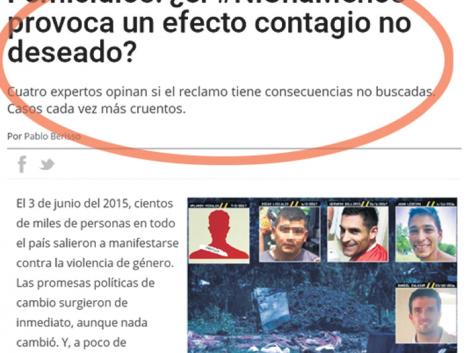 Es cierto que la reiteración complica las coberturas, pero la imaginación parece dejar en el camino a quienes podrían aportar a completar la trama social de estos hechos que cortan vidas particulares pero se inscriben en un sistema de dominación que hace posible que varones en singular se sientan autorizados a enseñorearse sobre la suerte de mujeres que creen de su propiedad. Al contrario, lo que surge de la necesidad de renovar la manera de dar cuenta de los femicidios produce artículos como el que ilustra esta nota que reclama silencio, que reclama obediencia, que se resiste al cambio, al respeto a la vida y la libertad de las mujeres. ¿Cuál es el “efecto contagio” que podría producir #NiUnaMenos?