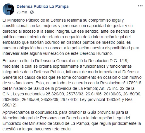 El Ministerio Público de la Defensa reafirma su compromiso legal y constitucional con las mujeres y personas con capacidad de gestar En un comunicado difundido en la red social Facebook, el Ministerio Público de la Defensa* manifiesta... abril 8, 2019 | POR Admin